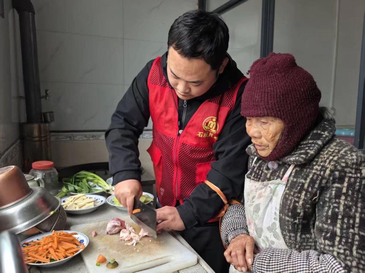 秦皇岛杨庄头村,志愿者邀请7位老人到志愿者自家开设的面馆中包饺子,还统一给老人们修剪头发。