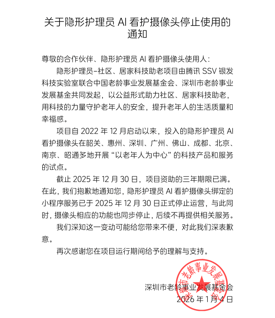 “隐形护理员—社区、居家科技助老项目”自2022年12月启动以来,在韶关、惠州、深圳、广州、佛山、成都、北京、南京、昭通多地开展了以老年人为中心的科技助老试点,通过AI看护摄像头为长者提供安全关怀。至2025年12月30日,项目已圆满完成为期三年的公益支持周期。 我们很遗憾地通知大家,伴随项目周期结束,隐形护理员AI看护摄像头所绑定的小程序服务已于2025年12月30日正式停止运营,相关摄像头的各项功能也同步终止,后续将不再提供技术支持与服务。 感谢大家在过去三年中对项目的信任、理解与支持。未来,我们仍将持续探索科技助老的更多可能,期待在其它公益项目中继续与大家同行。 下方为本次通知的具体文件,请知悉~ -